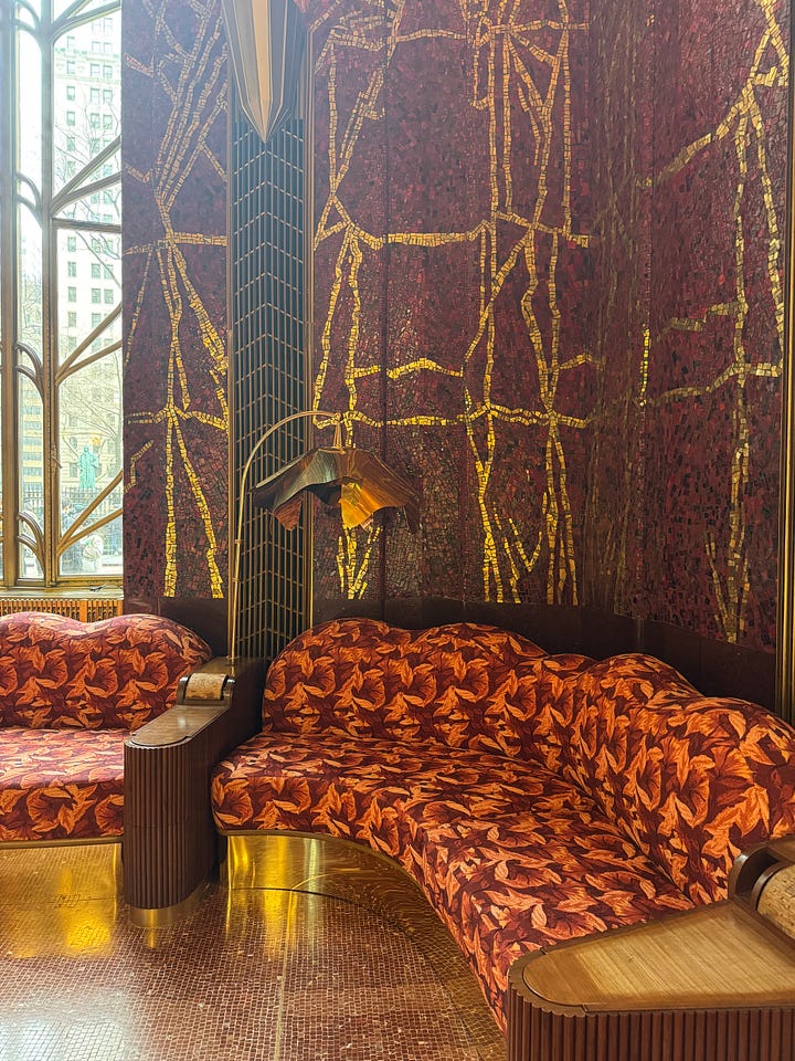 The area getting the most press right now (for good reason I might add) is the 1 Wall Street Banking Room, also referred to as the Red Room. The Irving Trust Company’s banking room originally opened in 1931, and served as an opulent image of prosperity and wealth after the 1929 financial collapse. Tile mosaics and murals were becoming popular again when 1 Wall Street’s architect tapped Hildreth Meière, a female muralist known for her Art Deco designs to adorn the room with her beautiful creations. Seeing this in person is truly breathtaking, especially when you understand the history. Chase Bank in 2025 could never.