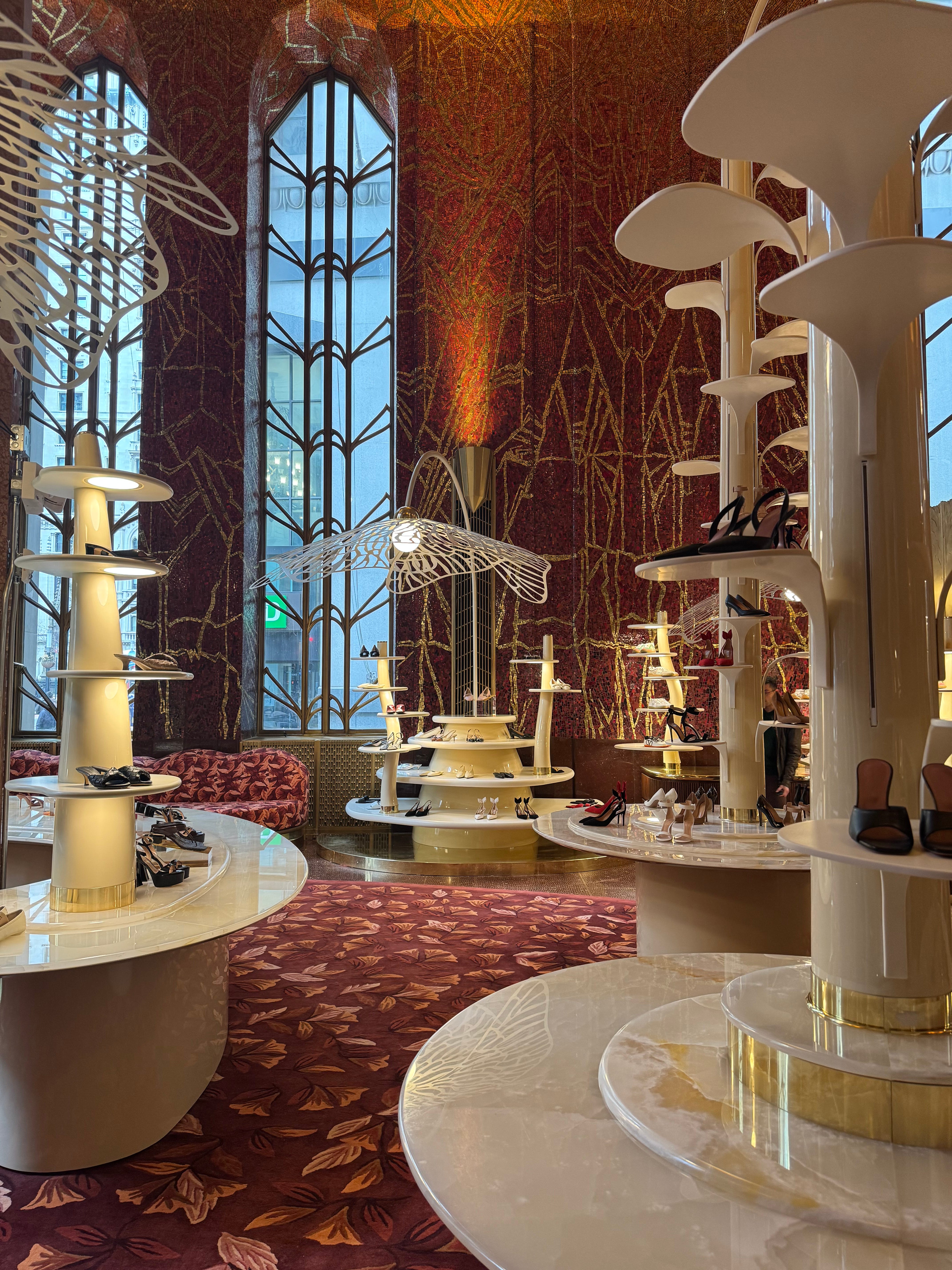 I love how Laura didn’t mimic the art deco nature of the room, rather she made the room playful, and fun by adding curves, lilypad-esque displays and larger than life floral light fixtures - everything I want when I am browsing for shoes and want to make a purchase that may or may not be questionable for my bank account. Oh the irony..